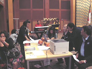 Kesibukan panitia menjelang closing ceremony: menyusun ranking akhir, menyusun acara, dan tentu saja menyiapkan hadiah uang yang totalnya 137 juta rupiah! (Kalo pake pecahan ribuan pasti ga bisa diamplopin, terpaksa dimasukin ke plastik kresek… plastik kresek yang warna hitam biar ga diincar copet… Kira-kira para juaranya mau nerima apa enggak ya? Mungkin mau – wong namanya duit siapa yang gak mau – tapi sambil ngedumel ‘kali ya?) Tampak dari kiri: Sekretaris Panitia Merry Damayanti (pas dijepret lagi batuk), Wasit Catur Wanita Luna Riasti, MC acara penutupan Ayu yang tengah menulis konsep, Wakil Ketua Panitia yang juga Wakil Sekjen PB Percasi FM Sebastian Simanjuntak, Ketua Bagian “Macam-macam” Henry Hendratno, ditonton oleh Grandmaster Cerdas Barus yang terbengong-bengong… Di latar belakang pemain organ tunggal sedang mencocokkan nada, bagi hadirin yang hobi nyanyi nanti dipersilakan tampil ke depan, daripada tiap hari nyanyi di kamar mandi seisi rumah sudah pada bosan….