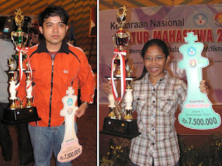 MI Tirta Chandra Purnama dari STIE Indonesia mempertahankan gelar juara di nomor perorangan putra, dan MNW Kadek Iin Dwijayanti dari Universitas Udayana Bali meraih gelar juara di nomor perorangan putri. Selain piala, masing-masing pulang sambil mengantungi (atau disembunyikan di tas?) hadiah uang tunai 7,5 juta rupiah ”Pokoknya bangga, suka, senang,” komentar Kadek ketika diwawancara singkat. ”Pendeknya bahagia deh…!”