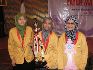 Juara nomor beregu putri dari Universitas Soedirman Purwokerto dengan para pemain MNW Sulung Wahyuningsih, MNW Dwi Kurnia Pravitasari dan Triani Budi Lestari. Selain piala tetap dari Mendiknas, mereka berhak membawa pulang (atau mungkin jalan-jalan dulu ya?) uang pembinaan 15 juta rupiah… (hati-hati loh kalo bawa uang tunai banyak, jaman sekarang copet dan tukang gendam juga makin banyak…!)