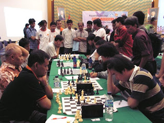 Foto kiri bawah: Partai MI Tirta Chandra Purnama (STIE Indonesia Rawamangun Jakarta) vs Bambang Christiansen (UKI) di nomor perorangan putra, ramai dirubung penonton yang tampak nikmat mengikuti dan ikut membayangkan apa yang sedang dipikirkan kedua pemain. Kalo sudah begini yang serba salah adalah Wasit Lapangan, dihalau pun para penonton itu pura-pura tidak mendengar…Foto kanan bawah: Lagi-lagi dirubung penonton! Ini memang partai-partai menegangkan yang ikut menentukan gelar juara nomor beregu putra antara STIE Indonesia Rawamangun (kiri) vs STMIK Mikroskill Medan. Yang kiri MN Surya Wahyudi dan Master FIDE (MF) Rian Kapriaga dari STIE Indonesia, menghadapi MN Yosafat dan MN Pitra Andika dari STMIK Mikroskill Medan. Partai-partai ini dimenangkan oleh STIE Indonesia dengan skor 2-1.